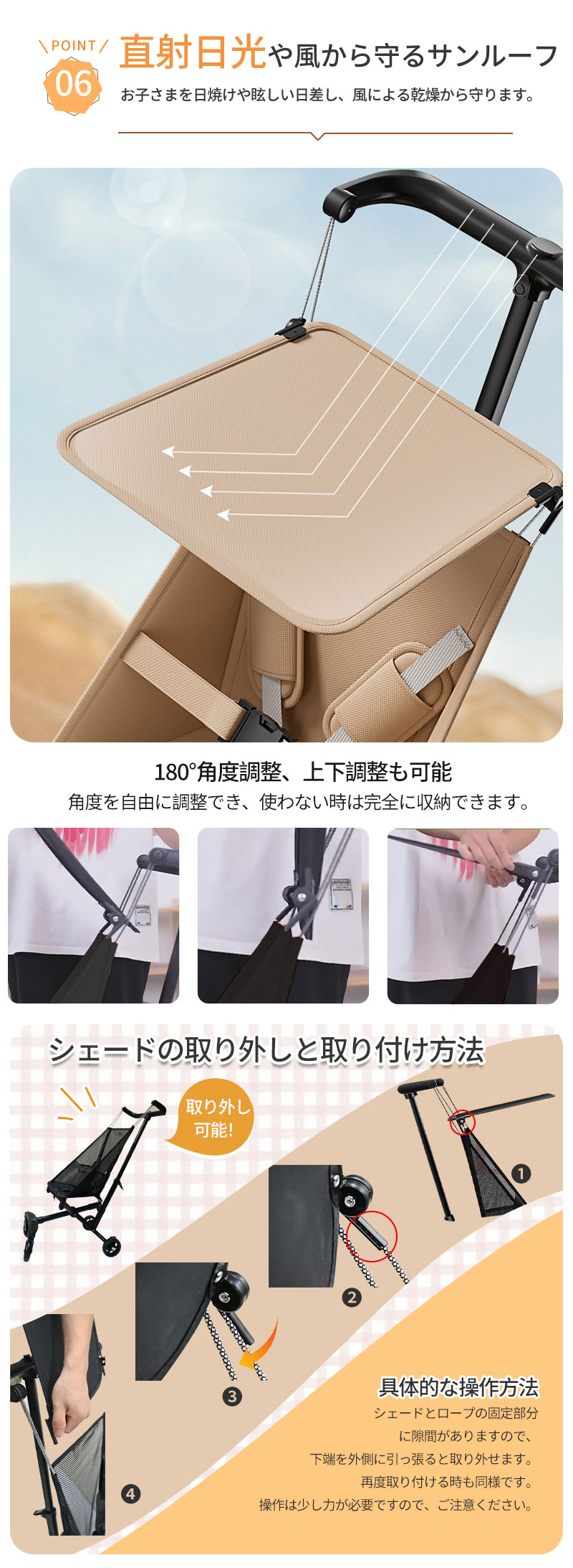 取り外し可能なサンルーフ付きで、強い日差しから赤ちゃんをしっかりガード。