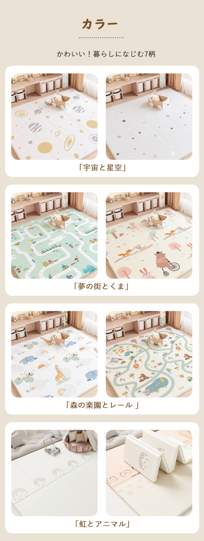 子どもの感性を育む7種類の可愛い柄&両面仕様で気分に合わせて使い分け。お部屋のインテリアにも自然に馴染み、遊びながら学べる楽しいデザイン!