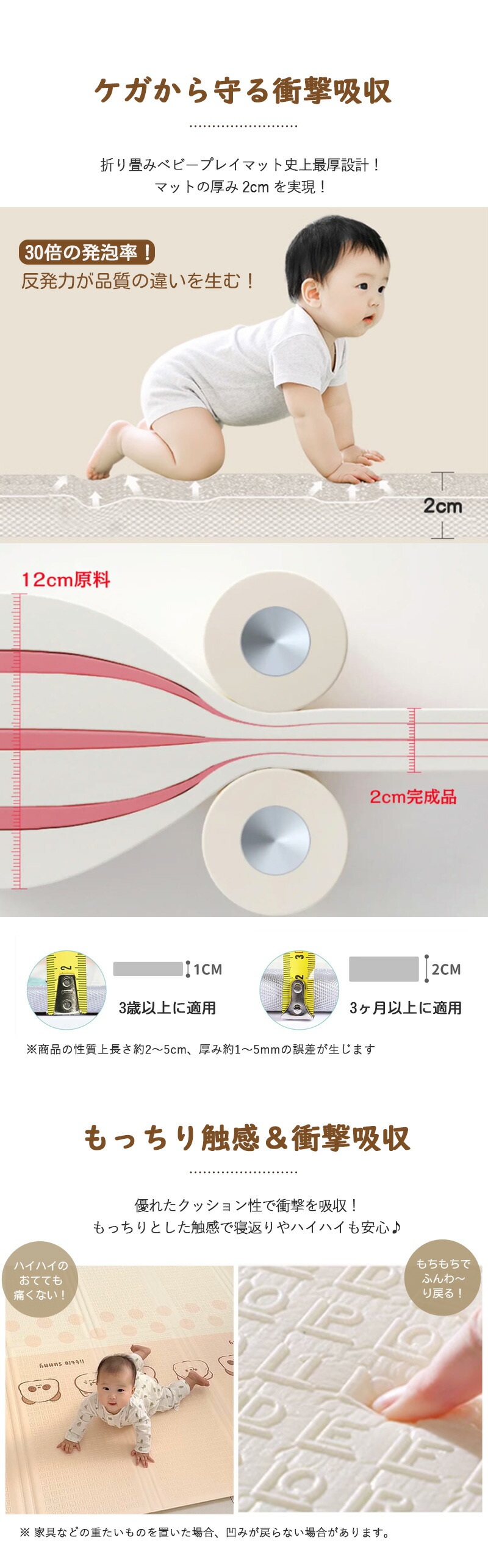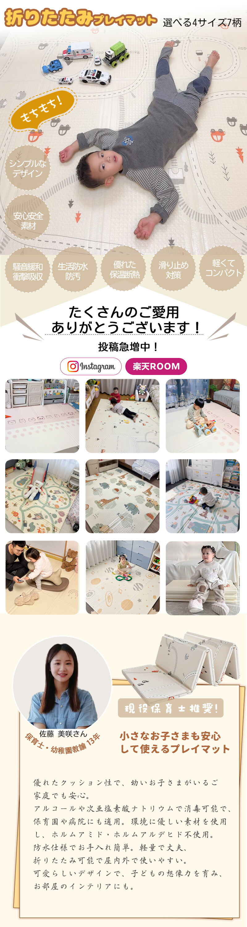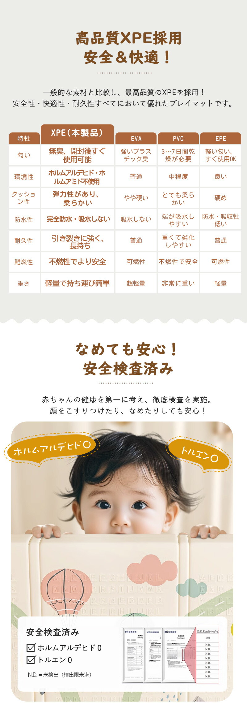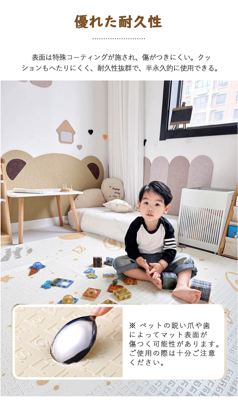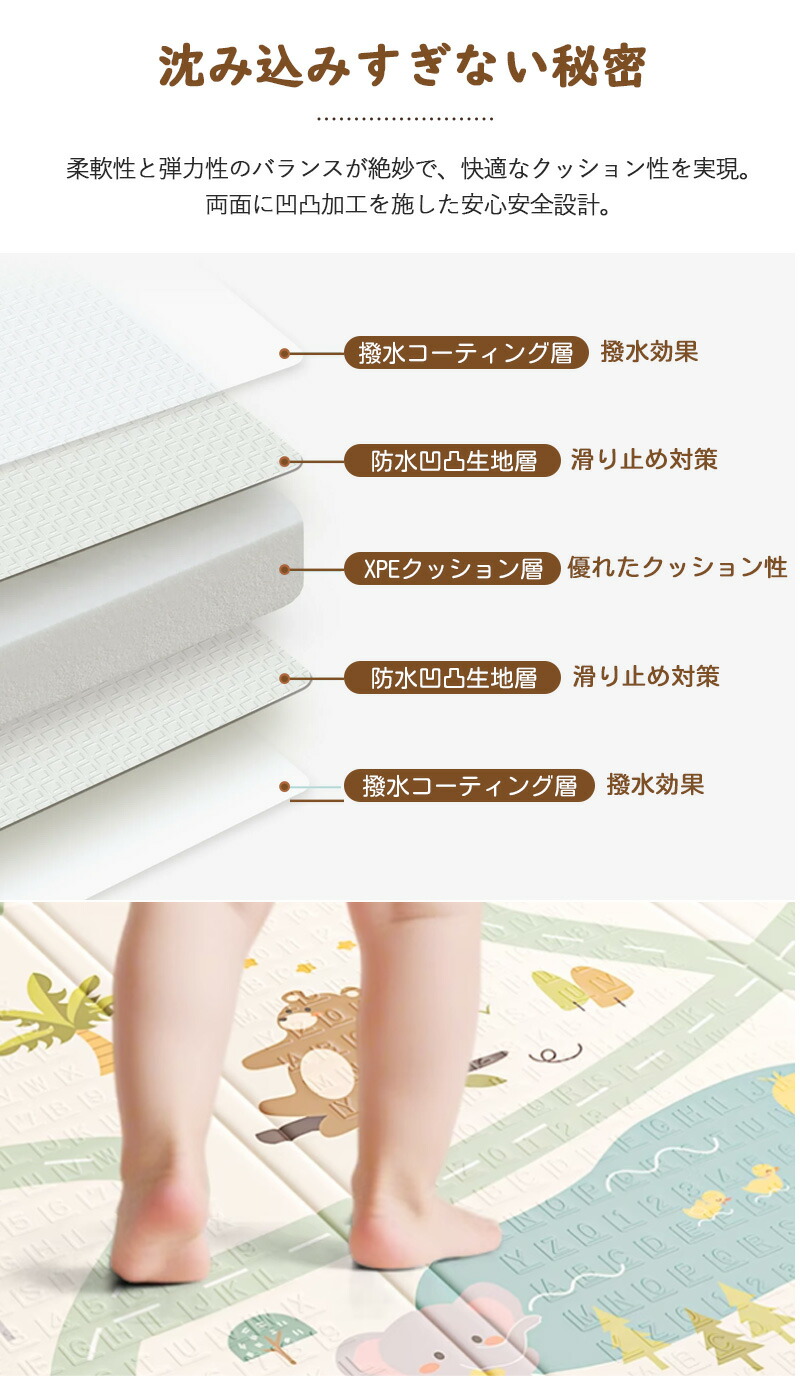 高品質XPE素材を採用し、ホルムアルデヒド・ホルムアミド不使用で無臭。顔をこすっても、なめても安心!現役保育士も推薦する、安全性重視のプレイマット。
