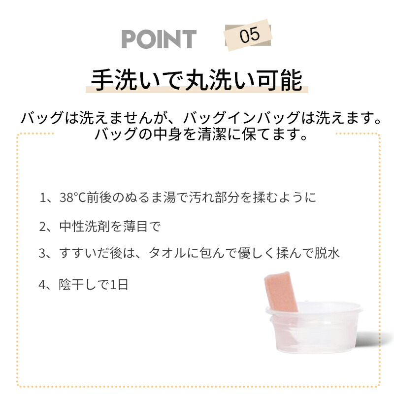 バッグインバッグは手洗いで簡単に洗濯可能。洗濯機を使わず、簡単な手洗いで清潔を保てます。