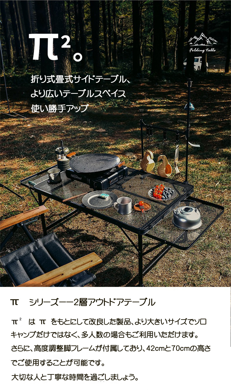 二段折りのデザインで、簡単かつ効率的に収納でき、実用性をより高めたアウトドアアイテム。熱い料理器具やコップなどを置いても安心して使えます。