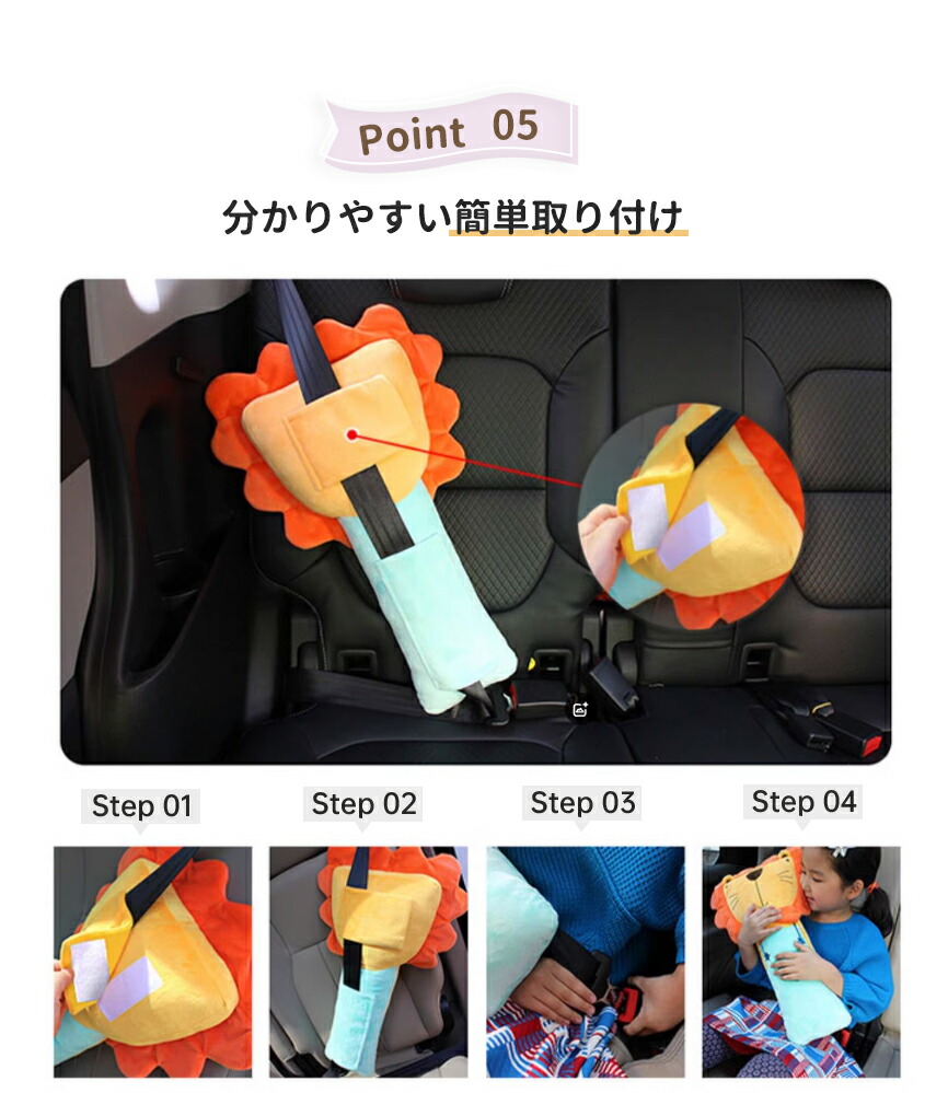 シートベルトクッションは、柔らかいぬいぐるみ枕付きで、子供から大人まで幅広い年齢層に対応。肩や首への負担を軽減し、長時間のドライブでも快適な乗り心地を提供します。