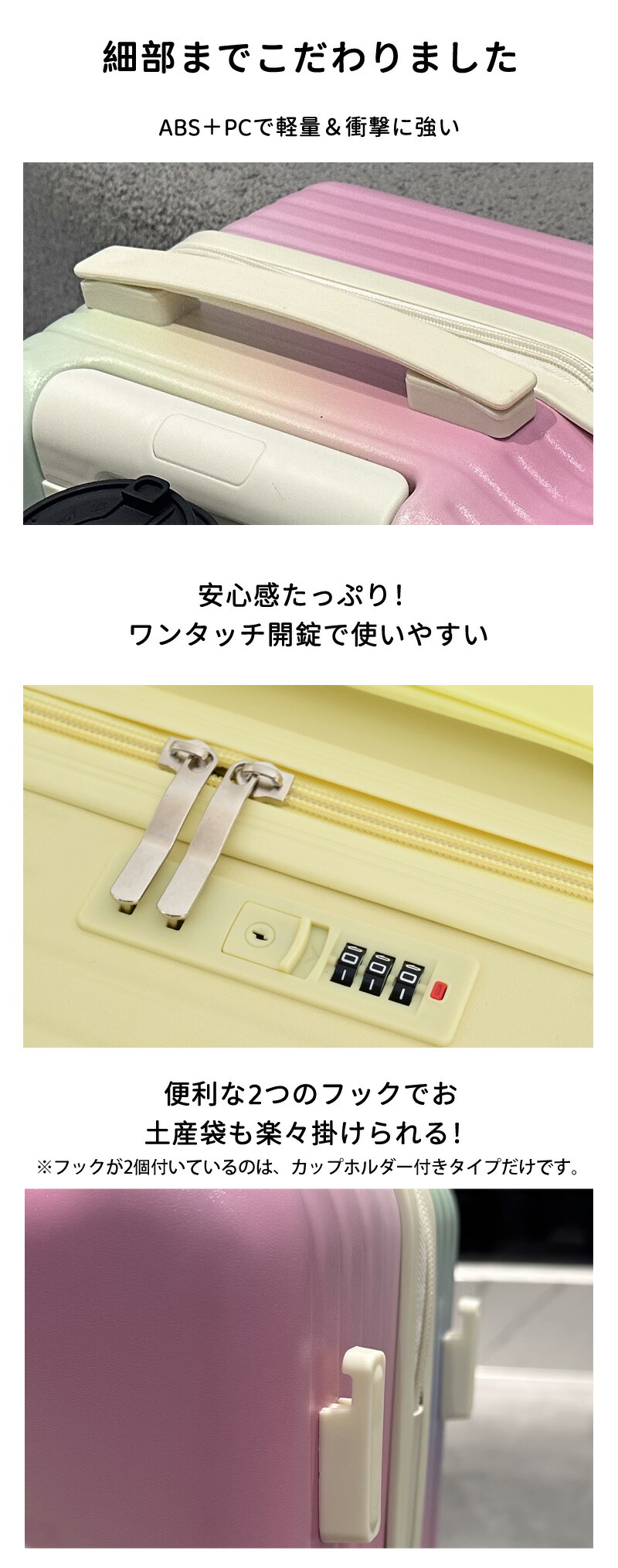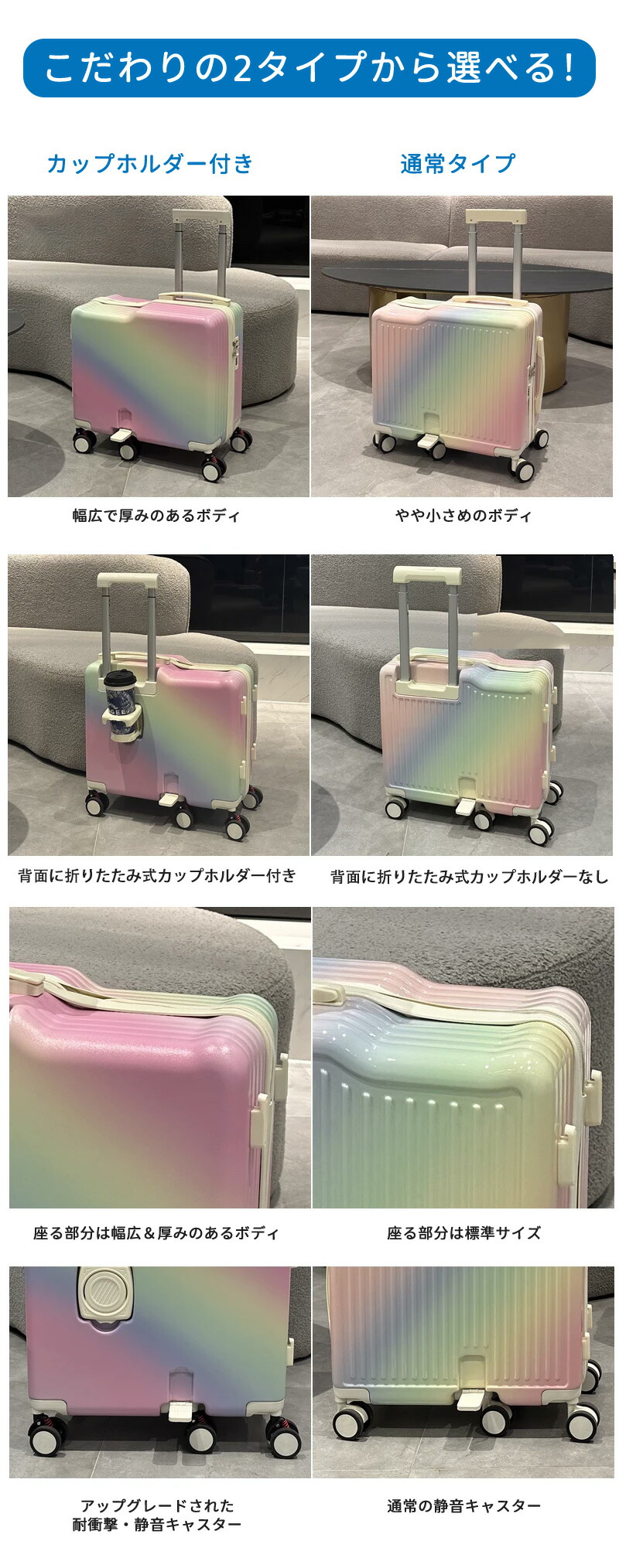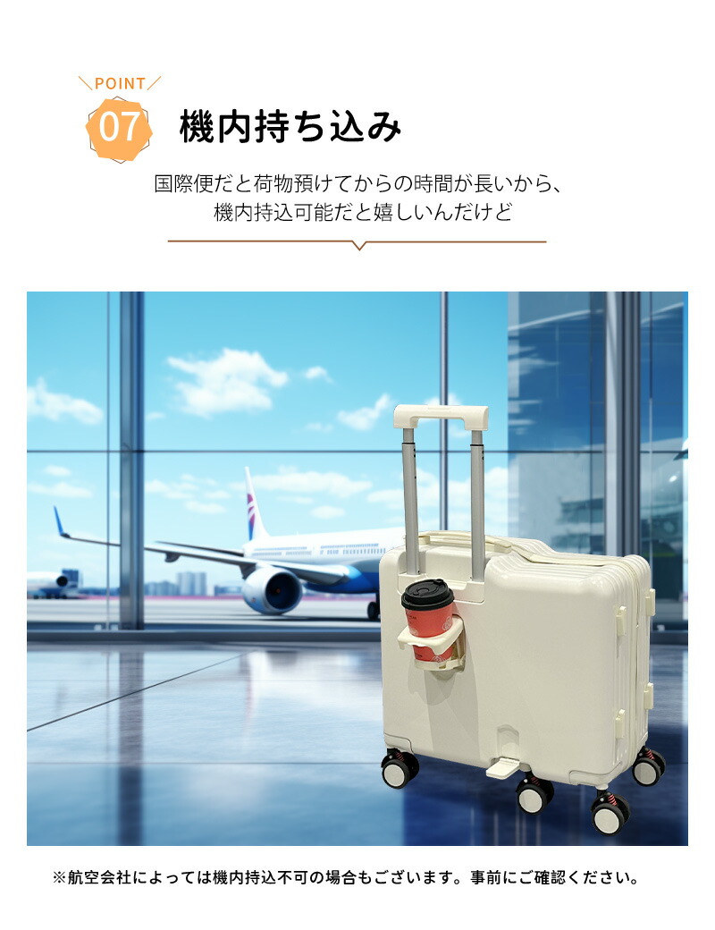 機内持ち込みサイズ対応で、フライト中も安心。ABS+PC素材で軽量&耐衝撃性に優れ、ワンタッチ開錠で使いやすい。タイプによってはカップホルダーやスマホスタンド付きでさらに便利。