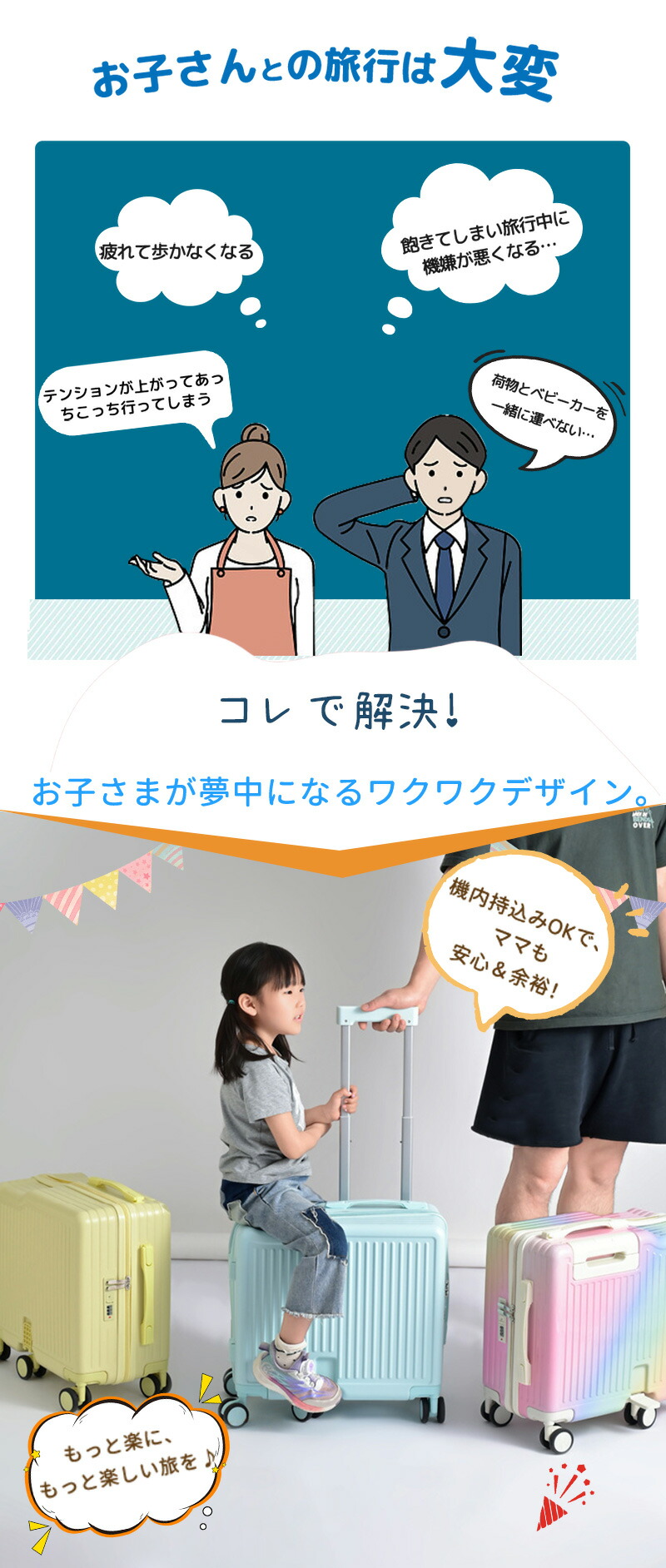 子供が自分から楽しく乗ってくれるワクワクデザイン。抱っこの負担を減らし、空港や旅行先での移動も快適。6輪静音キャスター&安定三角設計で安心して使えます。