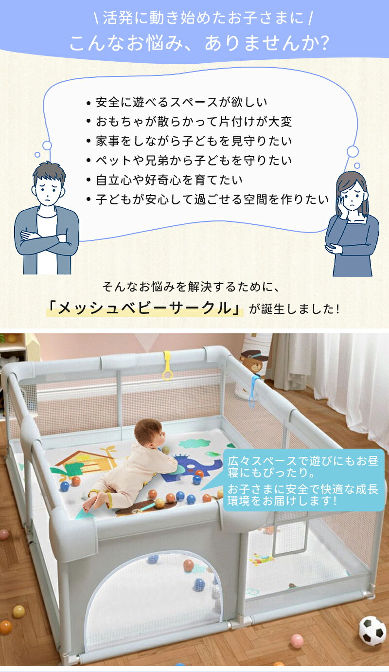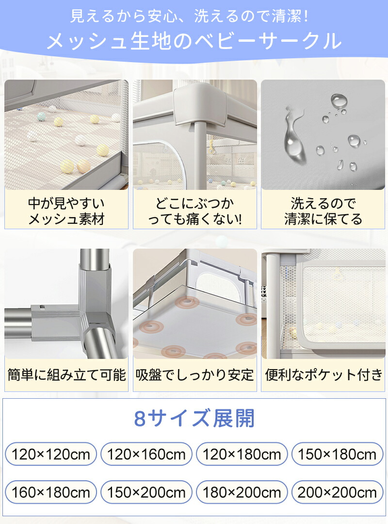 メッシュ ベビーサークル 折りたたみ式 プレイヤード 幼児 赤ちゃん用 持ち運び可能 ハイタイプ 長方形 正方形 リビング 保育園対応 組み立て簡単 洗濯可能 吸盤 サイズ展開 120×120×65cm 対象年齢 6か月 4歳