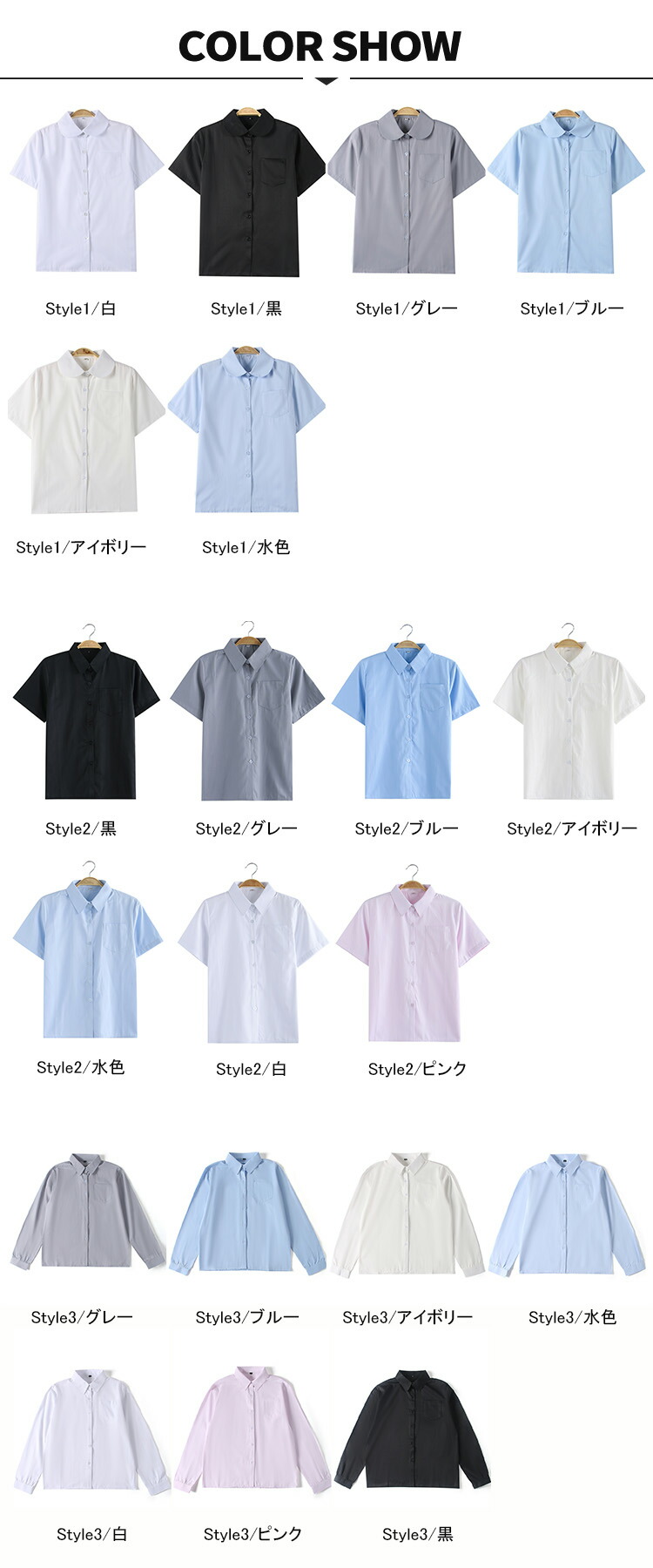 スクールシャツ 半袖 長袖 女子 制服 XS S M L XL 2XL 3XL 4XL 5XL Style1/白 Style1/黒 Style1/グレー Style1/ブルー Style1/アイボリー Style1/水色 Style2/黒 Style2/グレー Style2/ブルー Style2/アイボリー Style2/水色 Style2/白 Style2/ピンク Style3/グレー Style3/ブルー Style3/アイボリー Style3/水色 Style3/白 Style3/ピンク Style3/黒