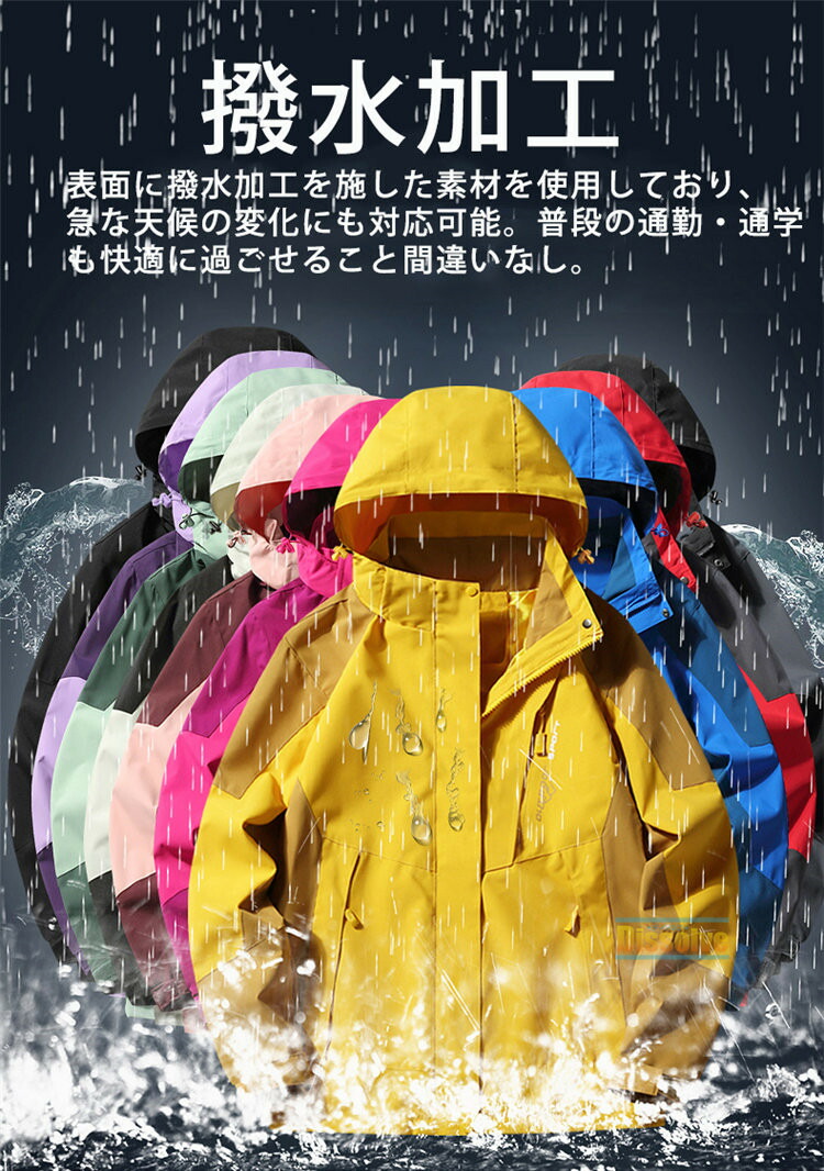 ※春や秋のアウトドア活動に最適なマウンテンパーカーは、撥水加工が施されており、急な雨にも対応します。