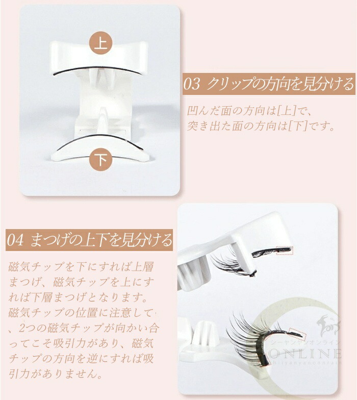 磁気チップを下にすれば上層まつげ、磁気チップを上にすれば下層まつげとなります。磁気チップの位置に注意して、2つの磁気チップが向かい合ってこそ吸引力があり、磁気チップの方向を逆にすれば吸引力がありません。