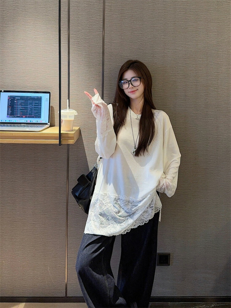 長袖 tシャツ 裾フレア レース切り替 トップス Tシャツ カットソー 人気 M L XL 2XL