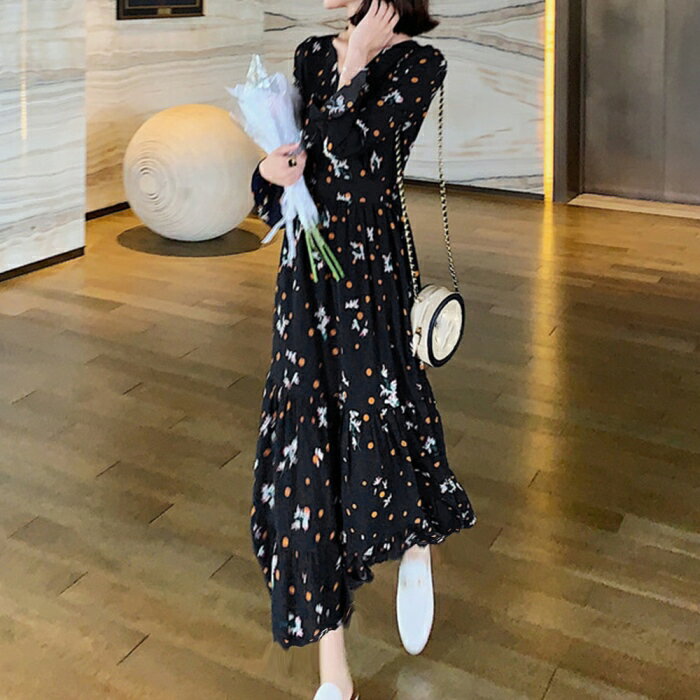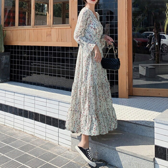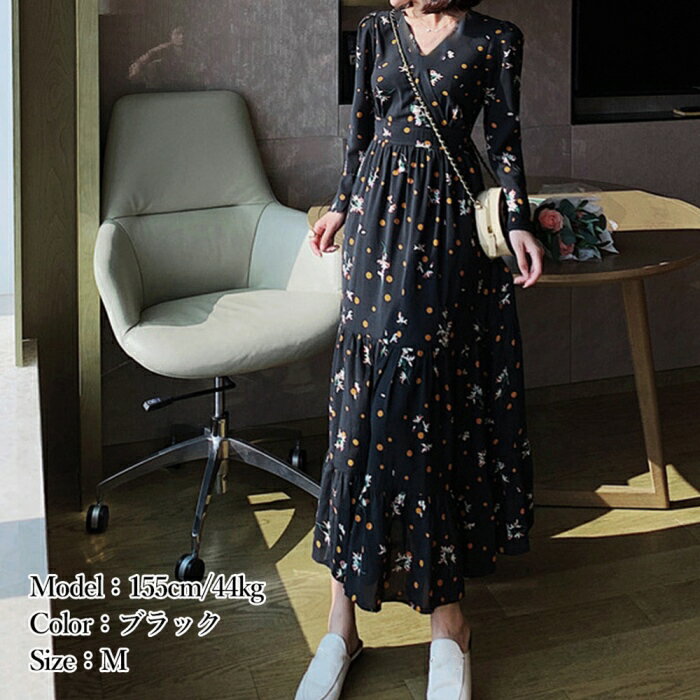 ワンピース 春 きれいめ 春コーデ 春ワンピ カジュアル 韓国ファッション L M 長袖 ガーリーコーデ カシュクール ティアード 花柄 ロング ドレス ぽっちゃり 大人カジュアル 結婚式