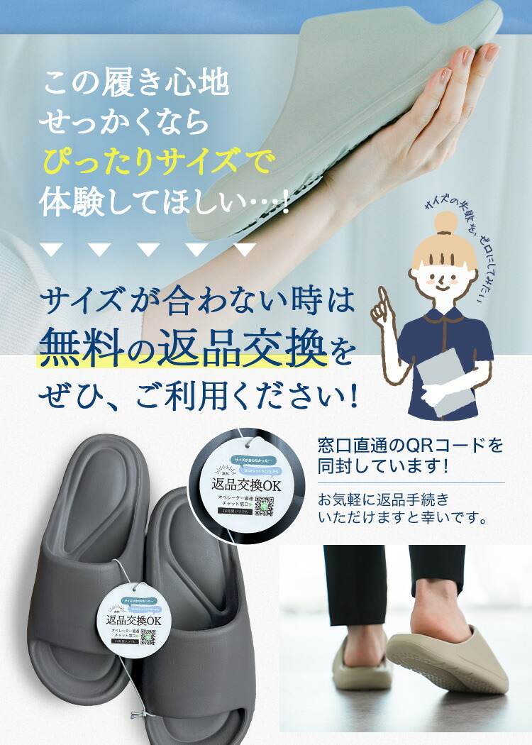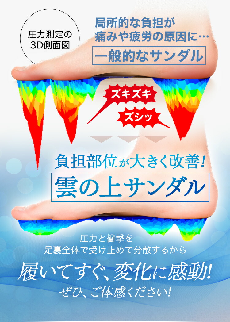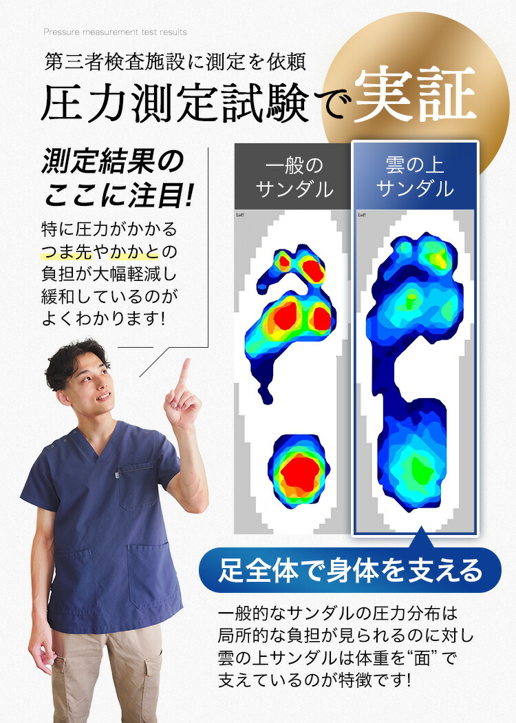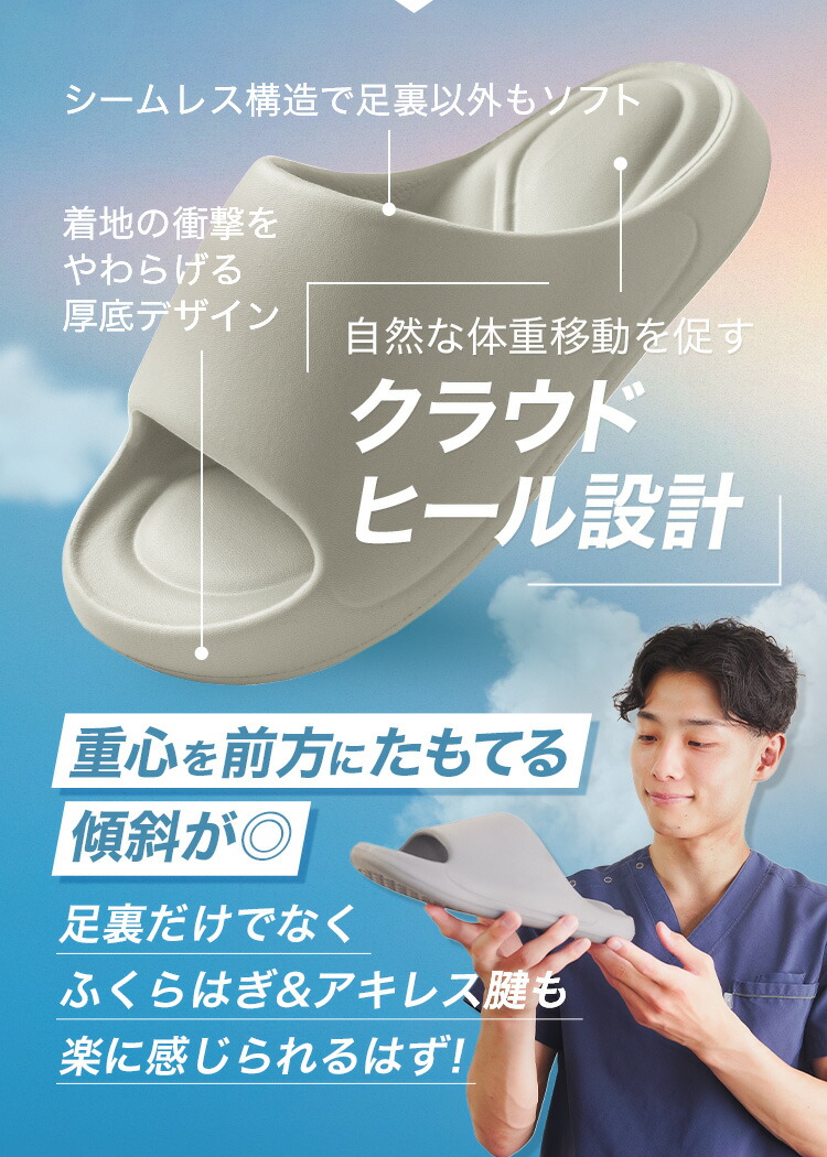 昨今話題のリカバリーサンダル。まるで雲の上を歩くような、ふかふかの履き心地が魅力です。足裏にかかる圧力を分散する設計()で、あなたを足元のストレスから解放します。衝撃を吸収するEVA素材と、歩行音の静かなアウトソールは室内履きに最適。オールシーズン快適で、ご自宅でのリラックスタイムをより上質なものにします。圧力分散試験クリア済