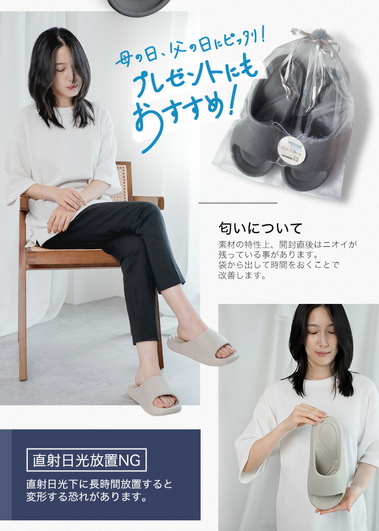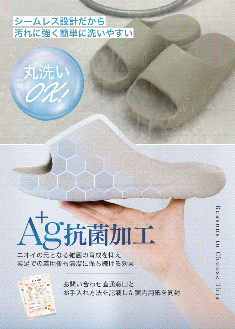 環境に優しいEVA素材を使用し、抗菌防臭機能をプラスした清潔なサンダルです。Ag+銀イオン加工でニオイの発生を抑え、汚れたら丸洗いできるので衛生的。開封時に素材特有のニオイが気になる場合は、袋から出して風通しの良い場所で陰干ししてください。水はけが良く、滑りにくいソールで、シャワー後の使用から街歩きまで幅広く対応します。