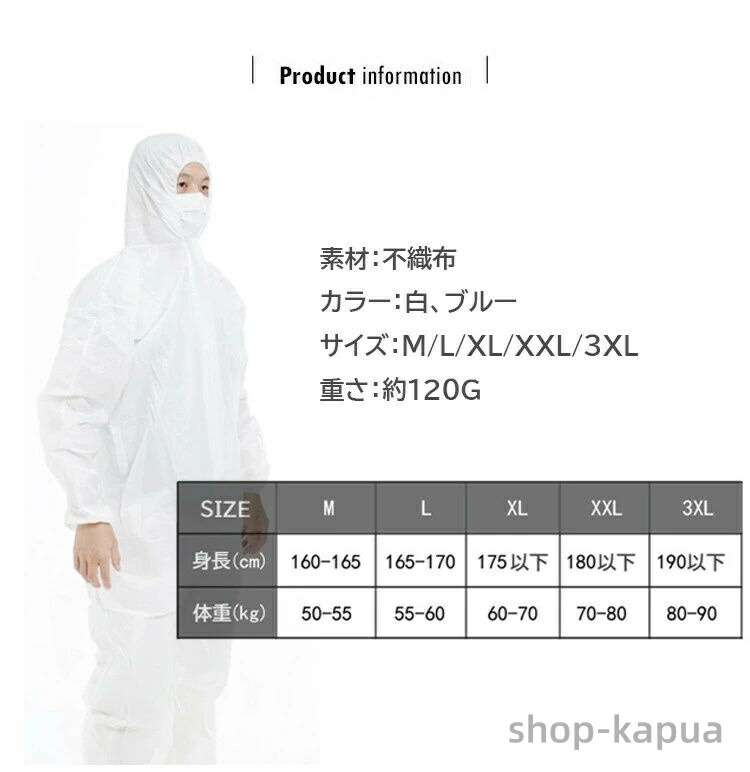 防護服 保護服 使い捨て 不織布 作業 メンズファッション 通販 M L XL XXL 3XL 白(PP-通常防塵):3630円税込 ブルー(PP-通常防塵):3630円税込 白(SMS-厚め防水):7150円税込 ブルー(SMS-厚め防水):7150円税込