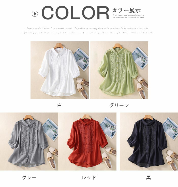 丸襟 シャツ 7分袖 レディース 刺繍 トップス シャツ ブラウス 続々登場 白 グリーン グレー レッド 黒 M L XL 2XL