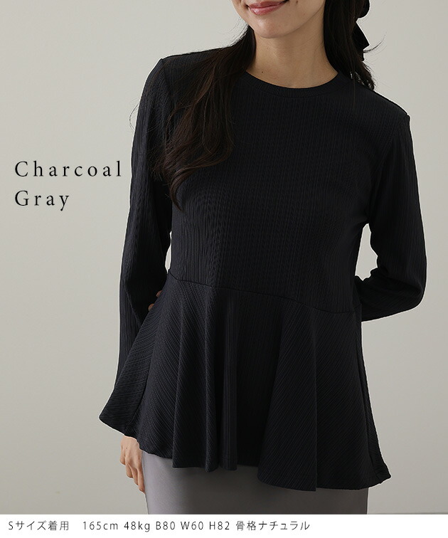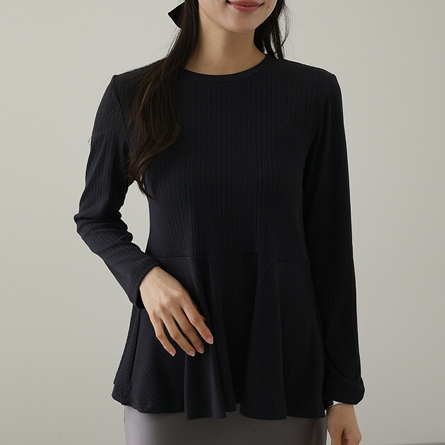 ランダム リブ ペプラム 長袖 カットソー トップス クルーネック セットインスリーブ 女性 レディース 春 秋 冬 無地 ストレッチ 細見え フィット 伸縮性 フェミニン 上品 きれ シンプル