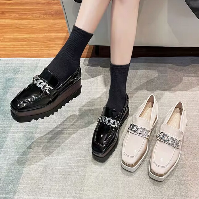ローファー レディース 厚底 スクエアトゥ エナメル チェーン マニッシュシューズ ブラック ウッド調ソール シャークソール オックスフォードシューズ