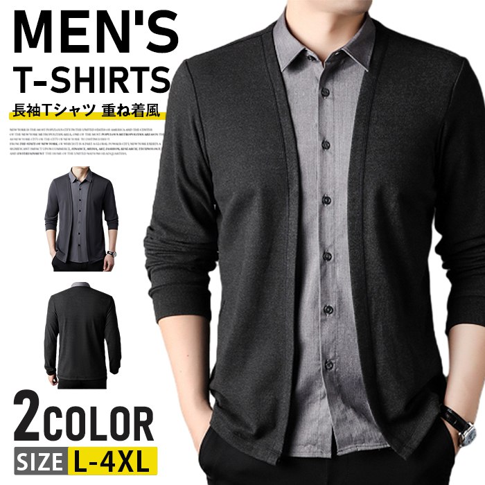長袖tシャツ 重ね着風 メンズ フェイクシャツ付き 大きいサイズ 長袖 色切り替え フェイクレイヤード 折り襟