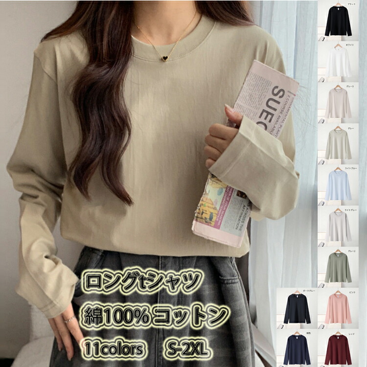 ロンt レディース 綿100% コットン 長袖tシャツ レディース長袖 tシャツ 春 秋 無地 カットソー ロングtシャツ 長tしゃつ 重ね着 インナー 白 ロンティー ロングティーシャツ チラ見せ