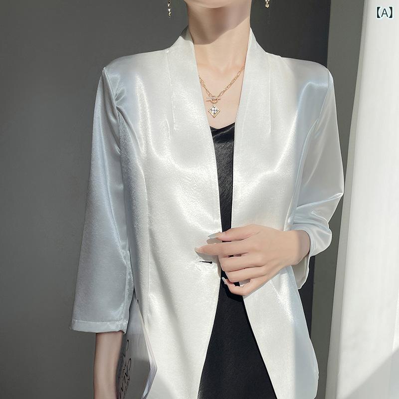 ジャケット レディース 春夏 七分袖 サテン生地 アセテート素材 高級感 エレガント 通勤 オフィス ビジネス ゆったり ショート丈 一つボタン アイロン不要 シャンパン ゴールド ブラック ホワイト
