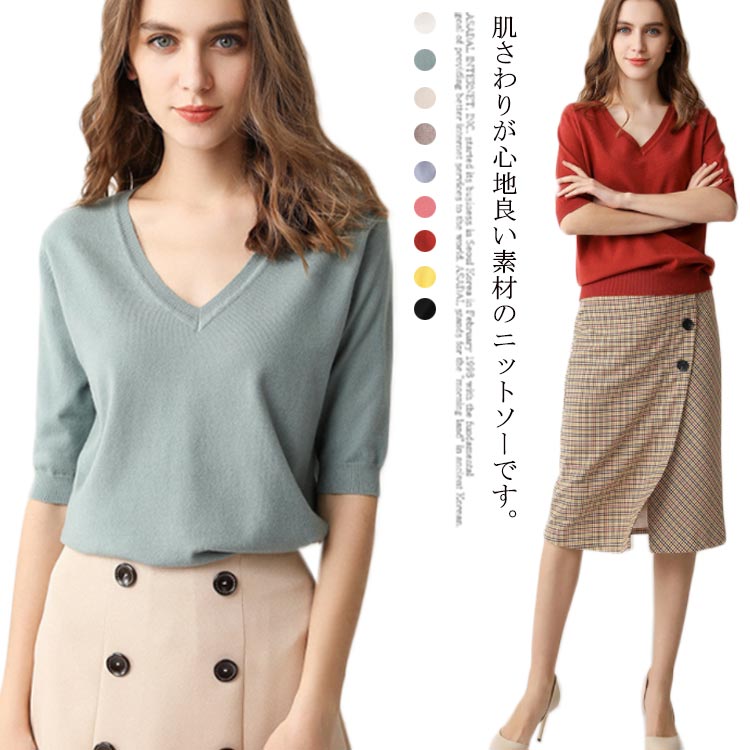 半袖 五分袖 Vネック トップス ニットセーター サマーニット レディース プルオーバー ドロップショルダー 薄手 シンプル 無地 ニット きれいめ