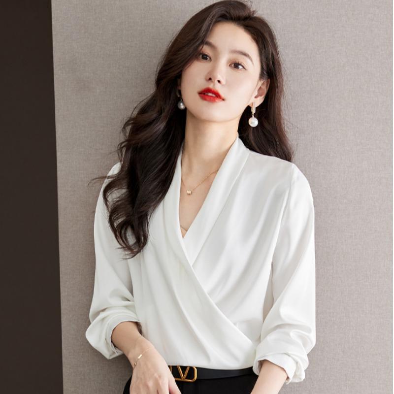 ブラウス レディース 秋 きれいめ 女性 カジュアル アセテート サテン ドレープ シャツ Vネック プルオーバー 長袖 通勤 オフィス 薄手 柔らかい トップス フォーマル 軽量