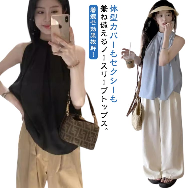 ノースリーブブラウス 夏 トップス タンクトップ 涼しい ギャザー タック レディース 体型カバー きれいめ バンドカラー セクシー ブラウス ハイネック 袖なし プルオーバー