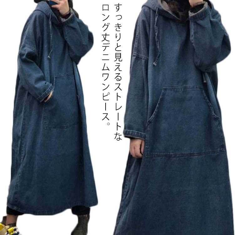 デニム ワンピース 長袖 レディース パーカー フードパーカー ロングパーカー プルオーバー カジュアル デニムワンピース ロング丈 ドロップショルダー ゆったり おしゃれ フー Aライン