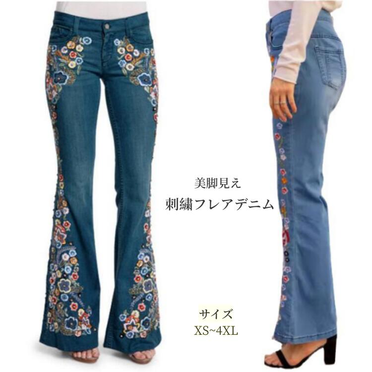 刺繍入り フレアデニムパンツ レディース花柄 刺しゅう ブーツカット 美脚 ジーンズジーンズレディース デニム パンツスキニーパンツキニー OLしわ加工 伸縮デニムダメージ 股上 ジーンズハイウエスト