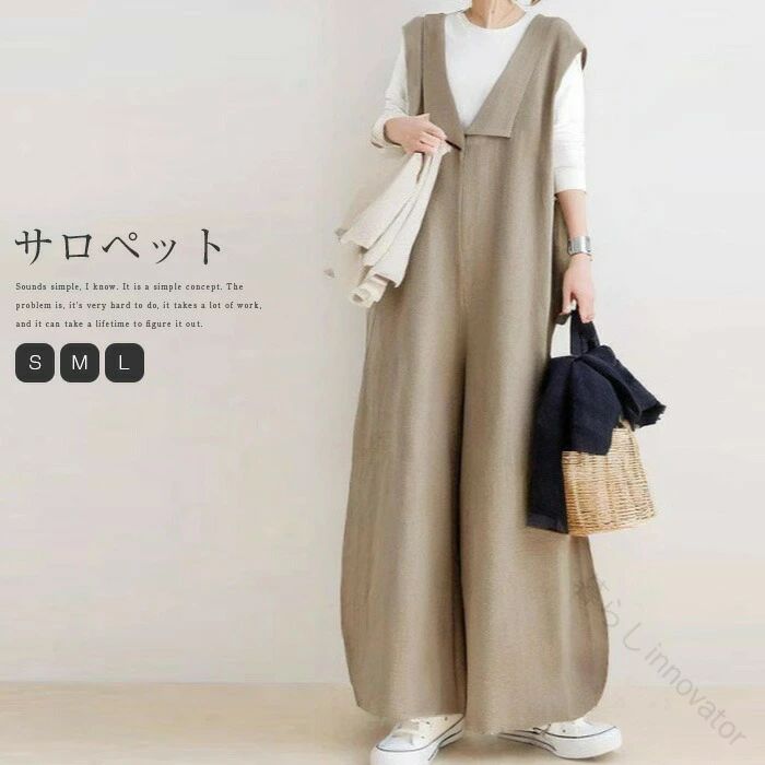 50代向け 40代 30代 20代 通学 通勤OL シンプル おしゃれ カジュアル 仕事 オフィス 春秋用 ゆったり体型カバー ロング丈 無地 オールインワン オーバーオール ワイドパン ノースリーブ