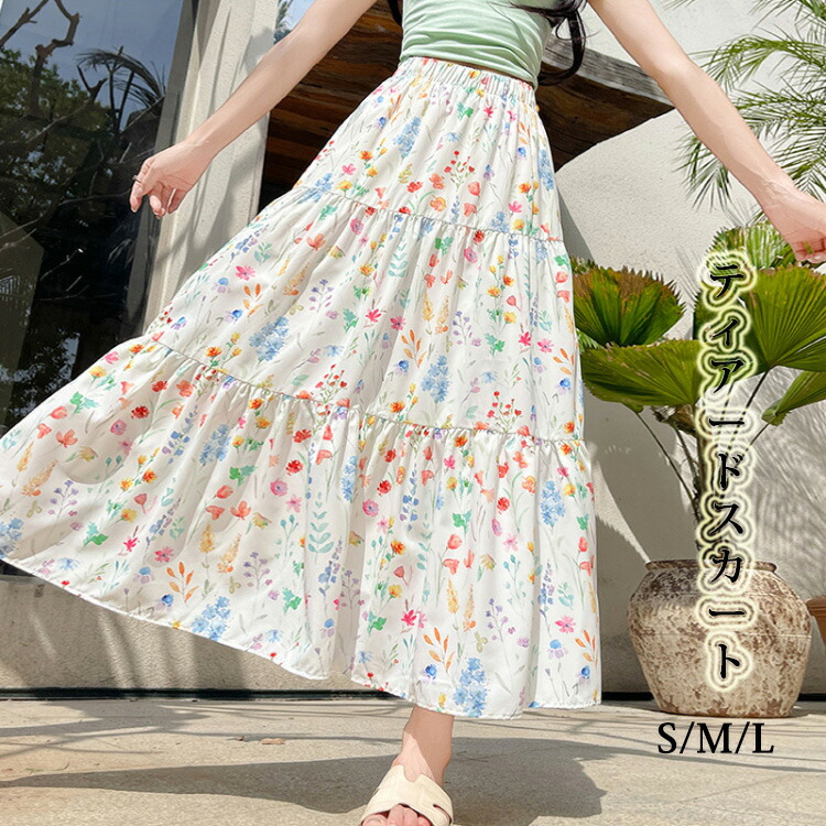 ティアードスカート ボトムス ロング丈 ハイウエスト ウエストゴム レディース 冷感 Aライン フレアスカート 裏地付き かわいい 大人可愛い きれいめ 上品 シンプル カジュアル オルチャ こなれ感