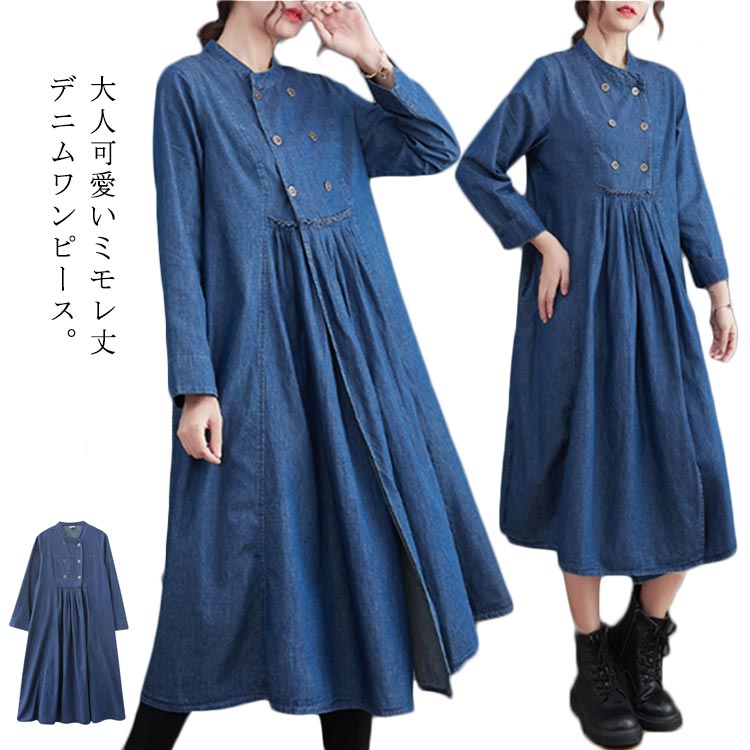 デニムワンピース デニム 長袖ワンピース ワンピース カジュアルワンピース ミモレ丈 膝下丈 体型カバー 春 大きサイズ ゆったり