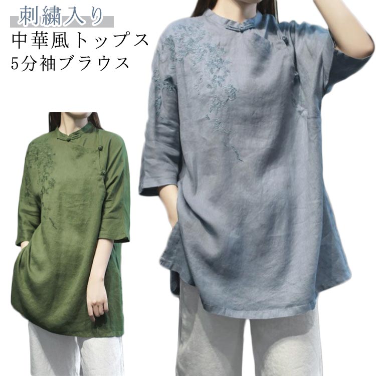 チャイナ風トップス 綿麻ブラウス レディース 5分袖シャツ 薄手