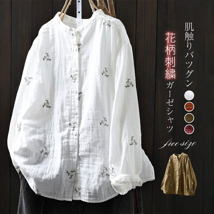 クーポンで2880円 ガーゼ シャツ 花柄 刺繍 長袖 バンドカラー 2重ガーゼ シャツブラウス レディース トップス 春 夏 秋 冬 カジュアル ナチュラル 羽織り 体型カバー 柔軟 ダブルガーゼ