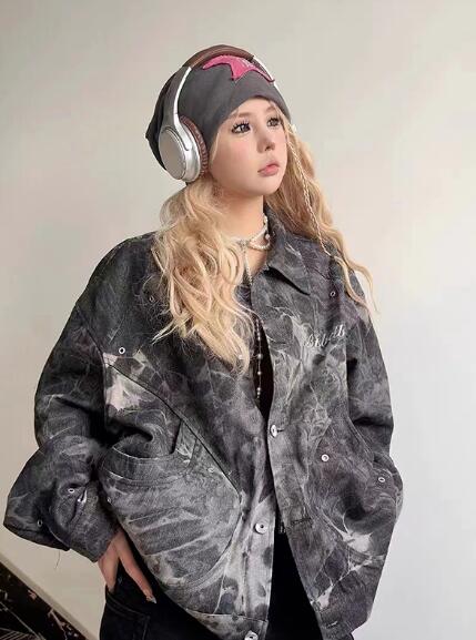 マーブルジージャンデニムジャケット長袖ジャンビッグプリントシンプルボタンポケットビッグ大きいサイズダンス衣装ヒップホップレディースガールズ大人ストリートアウタージャンパー韓国おしゃれ