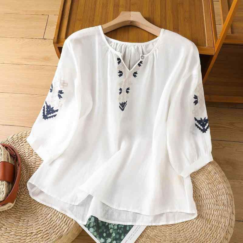 ブラウス レディース エスニック風 精緻刺しゅう コットンリネン 薄手 ラウンドネック バルーンスリーブ 通気性 五分袖 ショート丈 プルオーバー 普段使い 夏 ゆったり レトロ