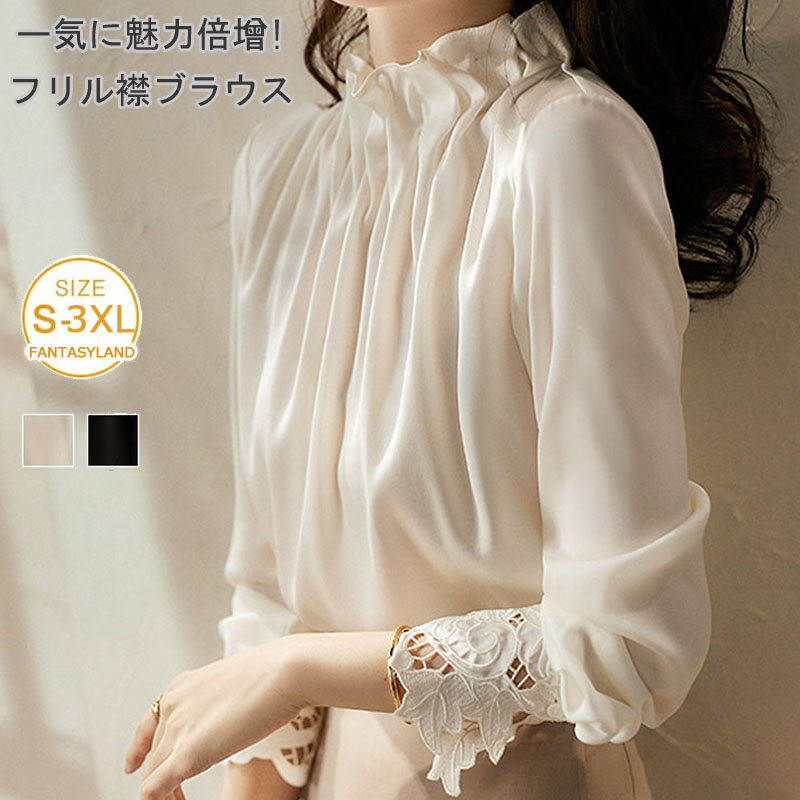 フリルネック シフォン ブラウス レディース トップス 長袖 シャーリング 無地 秋 冬 春 シンプル フェミニン ガーリー きれいめ オフィスカジュアル ブラック ミント グレー ホワイト