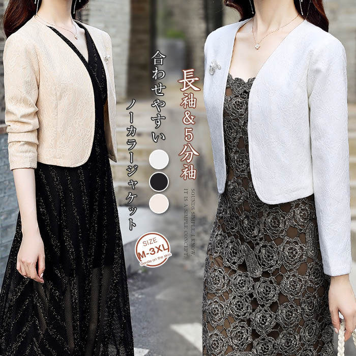 ノーカラージャケット レディース 春 秋 夏 長袖 5分袖 レース ジャケット ノーカラー ビジネス ~3 入学式 レースジャケット 白 黒 ベージュ ショート フォーマルジャケット