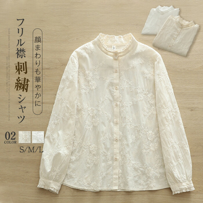 フリル襟 シャツ ブラウス レディース 長袖 綿100% 秋 冬 春 花柄 刺繍 レース シャツブラウス 長袖シャツ トップス 大きいサイズ コットン フォーマル カジュアル ナチュラル