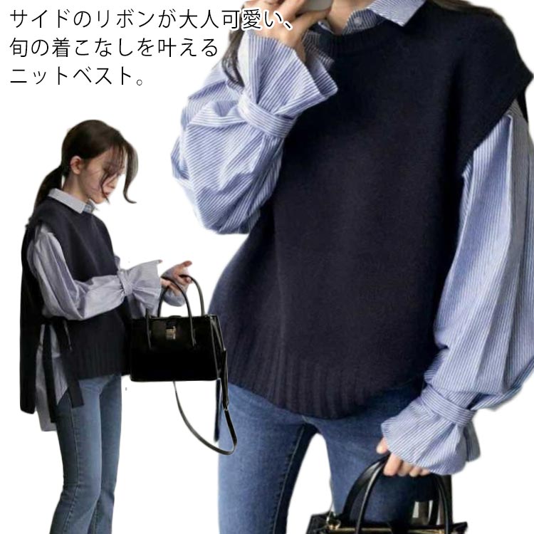 ベスト サイドリボン ニットベスト レディース トップス クルーネック セーター レイヤードベスト 春秋冬 重ね着 薄手 ジレ オシャレ オフィス 可愛い 韓国ファッション 通勤