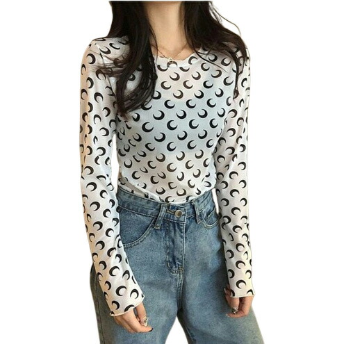 月柄3色シースルートップス長袖カットソー薄手透け感Tシャツインナー重ね着ダンス衣装ヒップホップHIPHOPレディースガールズストリート個性的スター星韓国おしゃれセクシーメロウメロー白黒緑総柄