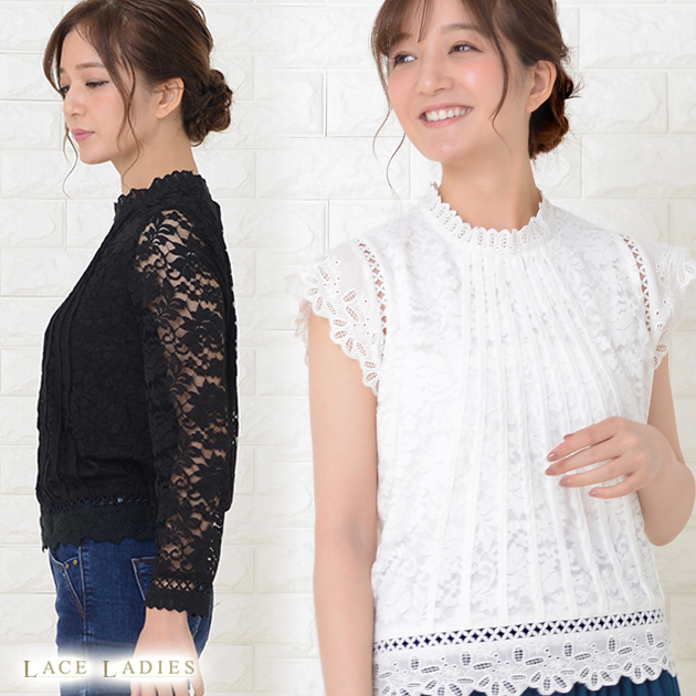 透かしレース 長袖 半袖 フリル カットソー レース 上品 薄手 レディース 通 高襟 立ち襟 パーティー 結婚式 フォーマル 二次会 ビジネス 通勤 OL ブラック ブラウス レースシャツ ホワイト