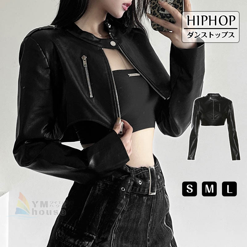 ダンス 衣装 ジャケット レディース ショート丈ジャケット レザー PU皮 ダンストップス 黒 ブラック 長袖 アウター 無地 ヘソ出し 個性 ダンス衣装 韓国ファッション ストリート系 かっこいい