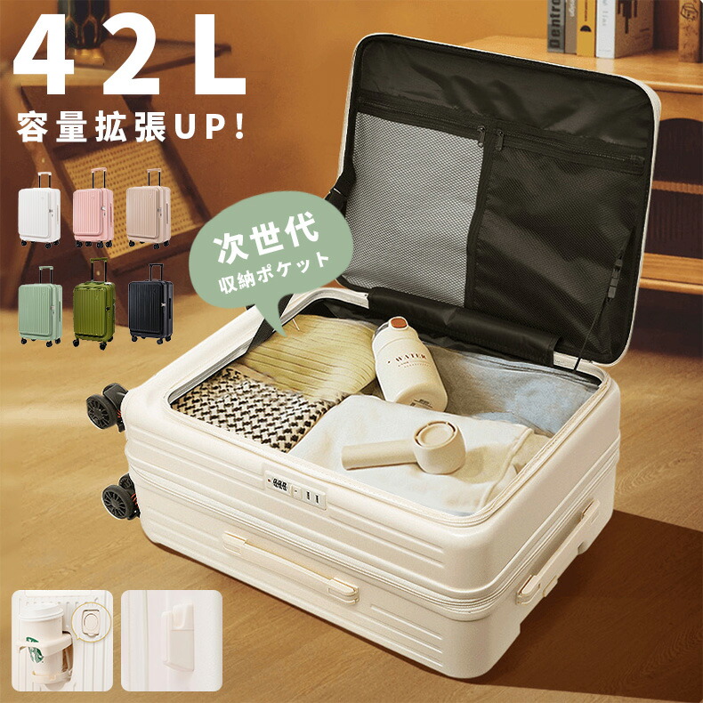 スーツケース キャリーケース 片開き ハード 拡張機能付き フロントオープン 大容量 機内持ち込み 超軽量 ファスナータイプ カップホルダー付き キャリーバッグ 横開き ビジネ YKKファスナーロック