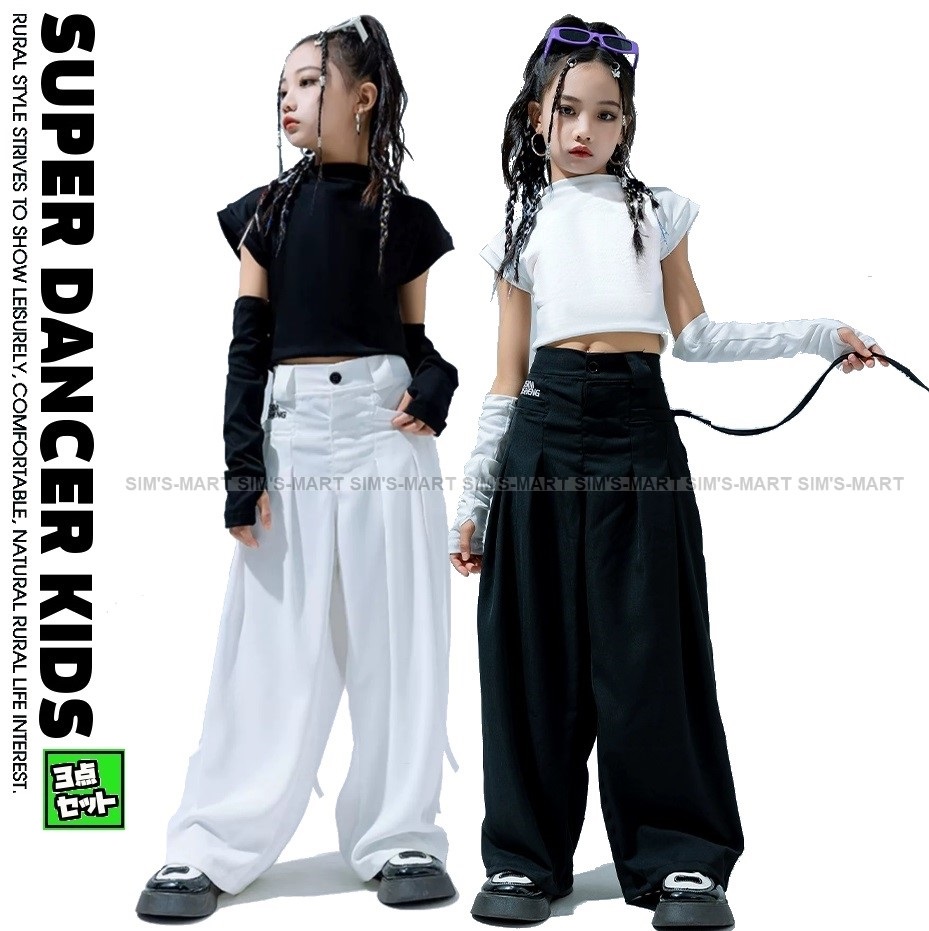 ダンス衣装 キッズ セットアップ ガールズ ヒップホップ 衣装 ヘソ出しトップス パンツ 派手 子供ダンス服 ダンスウェア 韓国 黒 白 K-POP