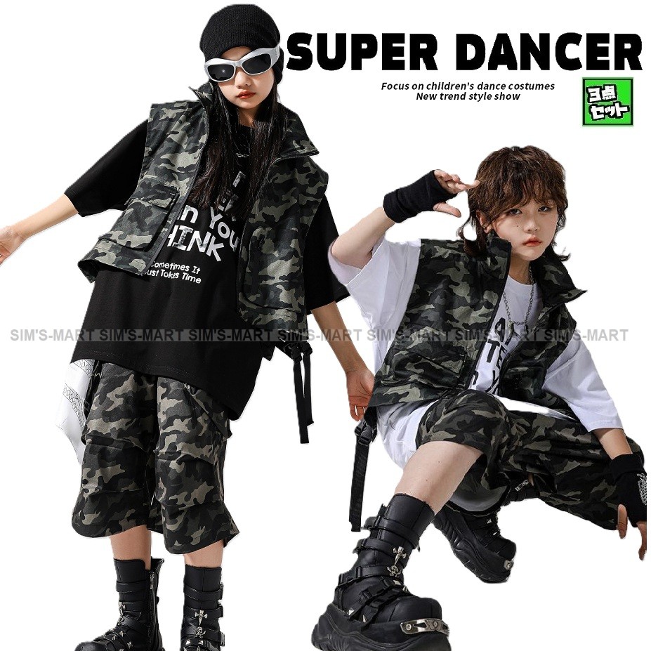 ヒップホップ ダンス衣装 セットアップ ミリタリー Tシャツ フィッシングベスト パンツ キッズダンス衣装 子供ダンス服 ダンスウェア K-POP カーキ ブラック 韓国