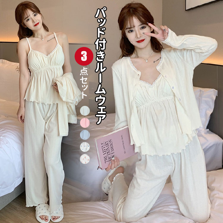 3点セット ルームウェア レディース パッド付き パッド取り外し可能 春秋 長袖 セットアップ パジャマ 部屋着 寝間着 上下セット 柔らかい肌触り 伸縮性高い 快適 おしゃれ 可愛い 5色 ゆったり