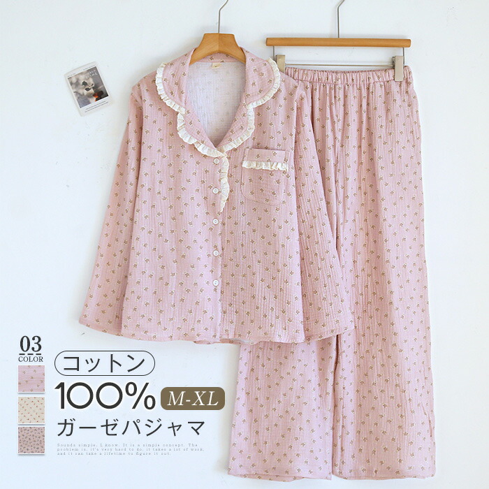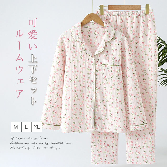 期間限定クーポン3380円 総柄 ガーゼ パジャマ レディース 花柄 総柄 ルームウェア 春 秋 冬 長袖 襟付き ロングパンツ ワイド 部屋着 寝間着 寝巻き 上下セット 前開き 春秋 秋冬