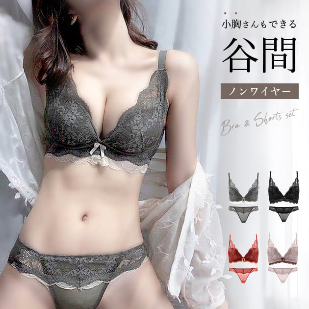 谷間メイク ブラ&ショーツ 2点セット ブラック モカ ワインレッド グリーン ノンワイヤーブラ レース ブラジャー 可愛い レディース 谷間 美胸 盛れる ランジェリー セクシー 脇高 ブラショーツ
