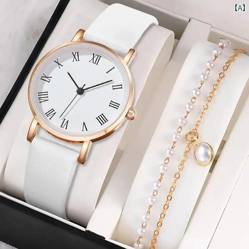 腕時計 レディース 女性用 ホワイト オーロラパール ブレスレット 2点セット カジュアル きれいめ 上品 エレガント 薄型 スリム フェイクレザー 合金製 ラウンド型 軽量