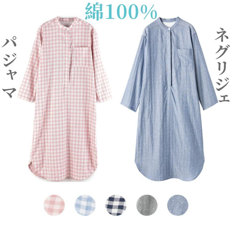 ネグリジェ ワンピース ルームウェア ナイトウェア 綿100% コットン100% ダブルガーゼ ルームワンピース ゆったりパジャマ オールシーズンチェク柄ドット柄前開き 入院準備 マタニティ ゆ 授乳
